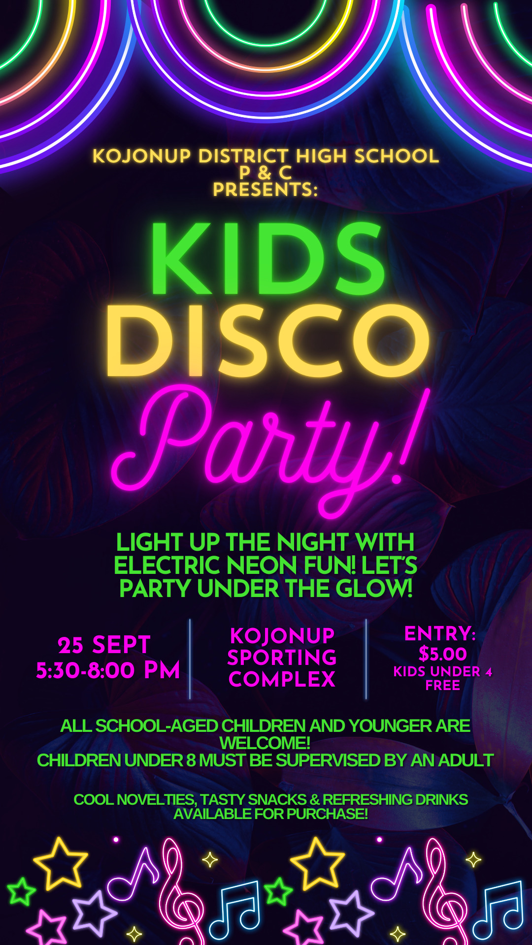 Our wonderful P&C is organising a disco for all school-aged children on Thursday 25th September, 5:30-8pm at the Sporting Complex.