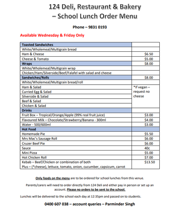 Lunch orders from 124 Cafe will be available on Wednesdays and Fridays each week. Please find the menu attached. Students can ONLY order from this menu at school. 124 Cafe will deliver the orders to the school at lunchtime.